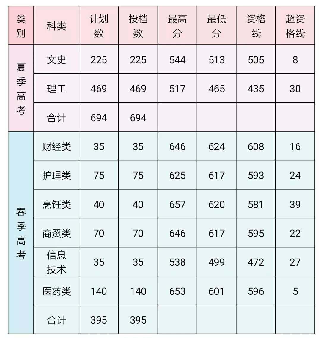 學(xué)院春季高考各類別也已全部投滿,其中財經(jīng)類最低分624分,高出省控線16分;護(hù)理類最低分617分,高出省控線24分;烹飪類最低分620分,高出省控線39分;商貿(mào)類最低分617分,高出省控線22分;醫(yī)藥類最低分601分,高出省控線5分;信息技術(shù)類最低分499分,高出省控線27分。