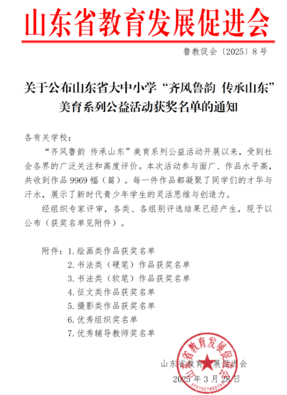 近日,山東省大中小學“齊風魯韻 傳承山東”美育系列活動落下帷幕,齊魯醫(yī)藥學院共獲獎32項,其中一等獎2項,二等獎9項,三等獎12項,優(yōu)秀獎9項。