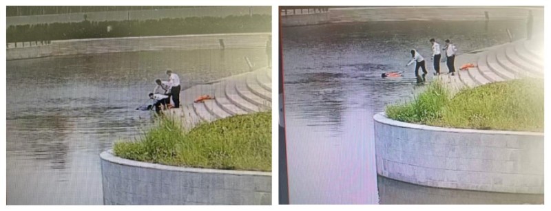 和超立即將現場情況上報物業監控中心請求支援,并同步撥打報警電話,他自己則持續大聲與阿姨保持溝通、言語安撫,努力穩定其情緒。張政則迅速跑向附近的應急物資存放點,取來救生圈與救生繩,奮力將救生圈拋投至阿姨附近水面,并高聲引導其抓住救生設備。很快,另一名聞訊趕來的隊員張萌也加入支援,三人默契配合、協力施救,最終成功將阿姨救助上岸。