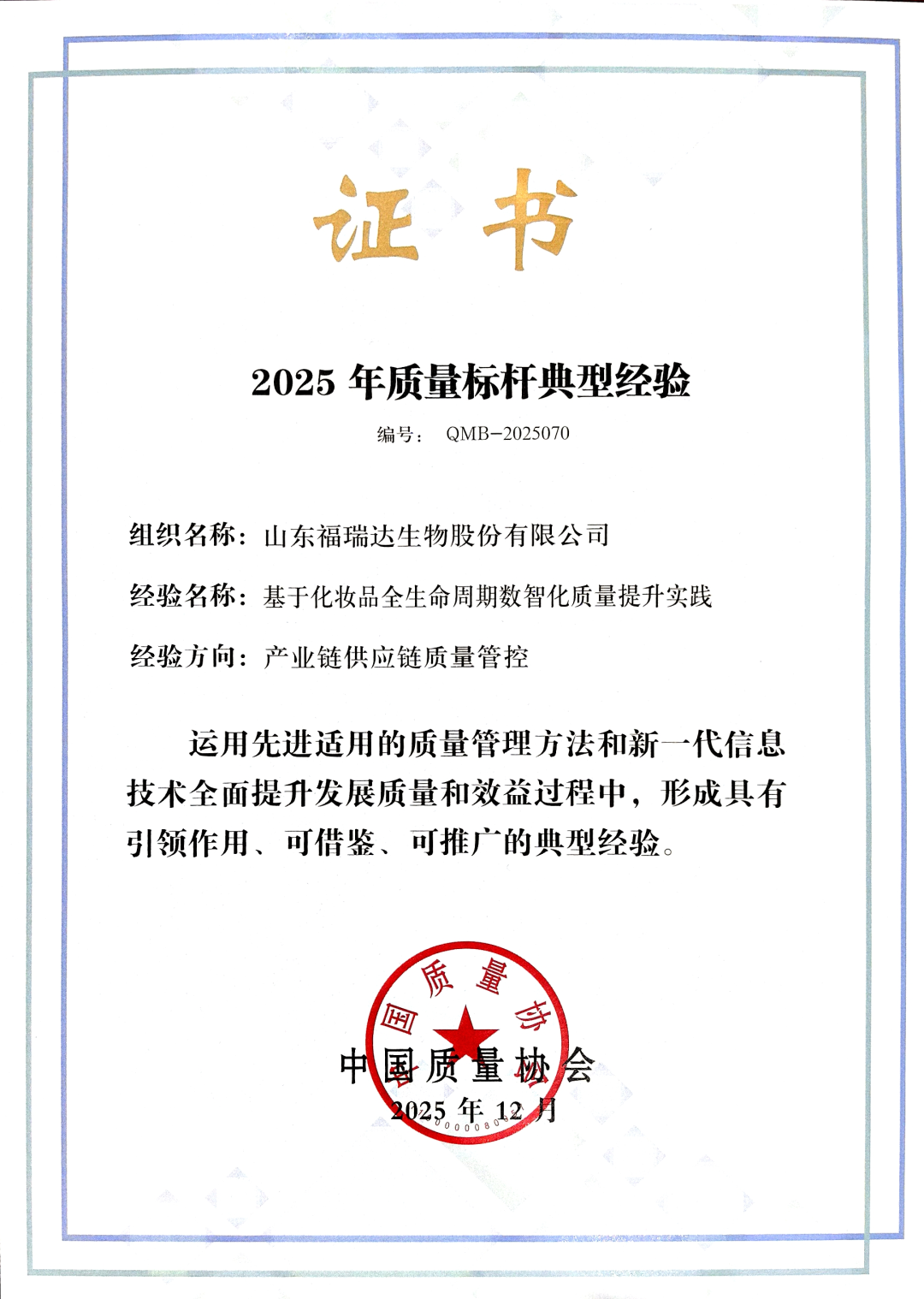 近日,魯商集團旗下福瑞達生物股份憑借“基于化妝品全生命周期數智化質量提升實踐”成功入選中國質量協會2025年全國質量標桿典型經驗,標志著公司在質量管理、智能制造領域的探索獲得權威認可。